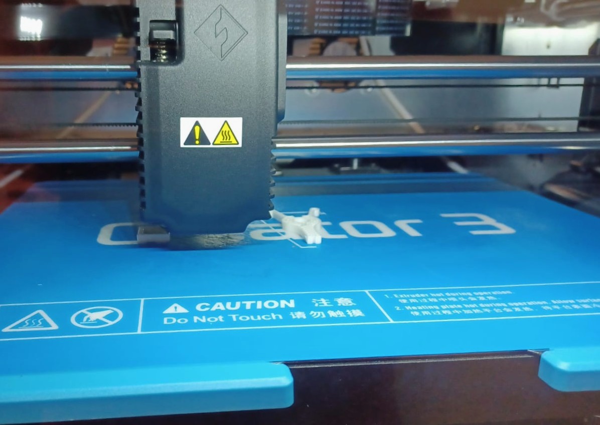 Kerroin muillekin mitä oli tapahtunut ja miten edettäisiin. Suuntasimme siis kirjaston alakertaan musiikkiosaston nurkkaan, josta pajalaitteet löytyvät. Vedin perusteiden esittelyn ja prosessin mallin valitsemisesta tulostuksen aloittamiseen. Valitsimme tulostettavaksi jotain hyödyllistä: pussinsulkijan. Tulostukseen kului aikaa vajaa tunti (sen verran oli varattua aikaa jäljellä), joka vaikutti myös mallin valintaan.